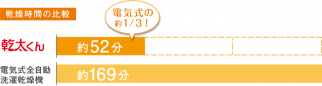 ガスのパワフルな温風で、5キログラムの洗濯物は約52分で乾燥します。これは、電気式乾燥機の約1/3の時間です。1日に2回のお洗濯でも、「乾太くん」なら2回目の洗濯が終了する頃には1回目の乾燥が完了していますから、とても効率的です。